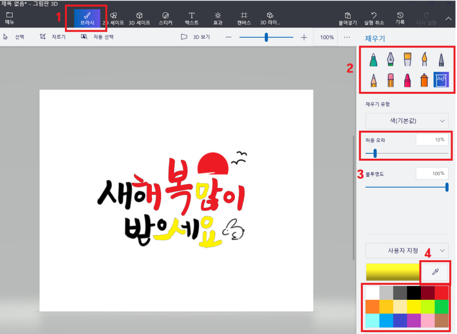 원하는 부분의 색을 간단하게 변경 할 수 있습니다. 포토샵 프로그램은 어렵게 느껴질 수 있지만, 그림판 3D는 직관적이고 아주 쉽게 할 수 있습니다. 특히, 포인트 컬러를 바꾸거나 간단한 보정이 필요할 때 유용합니다.