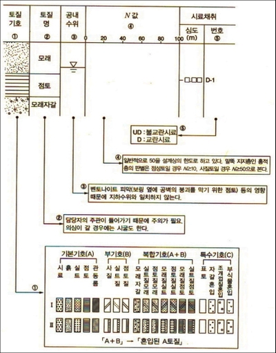 또한 표준관입시험, 토질시험등을 통한 지반의 경연상태와 지하수위 등을 표시하여 지하부위의 상태를 파악하여 기초설계 및 토공사 시공계획 등에 활용한다.