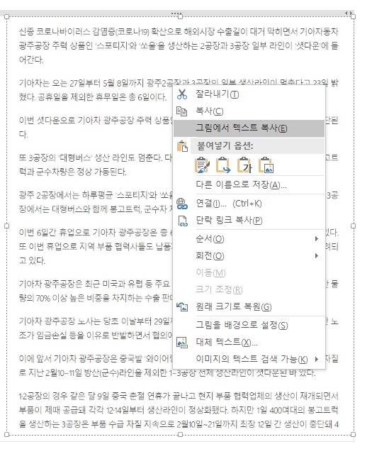 2. 마우스 오른쪽을 눌러 "그림에서 텍스트 복사"를 누른다.